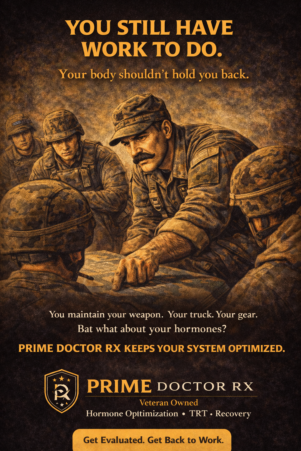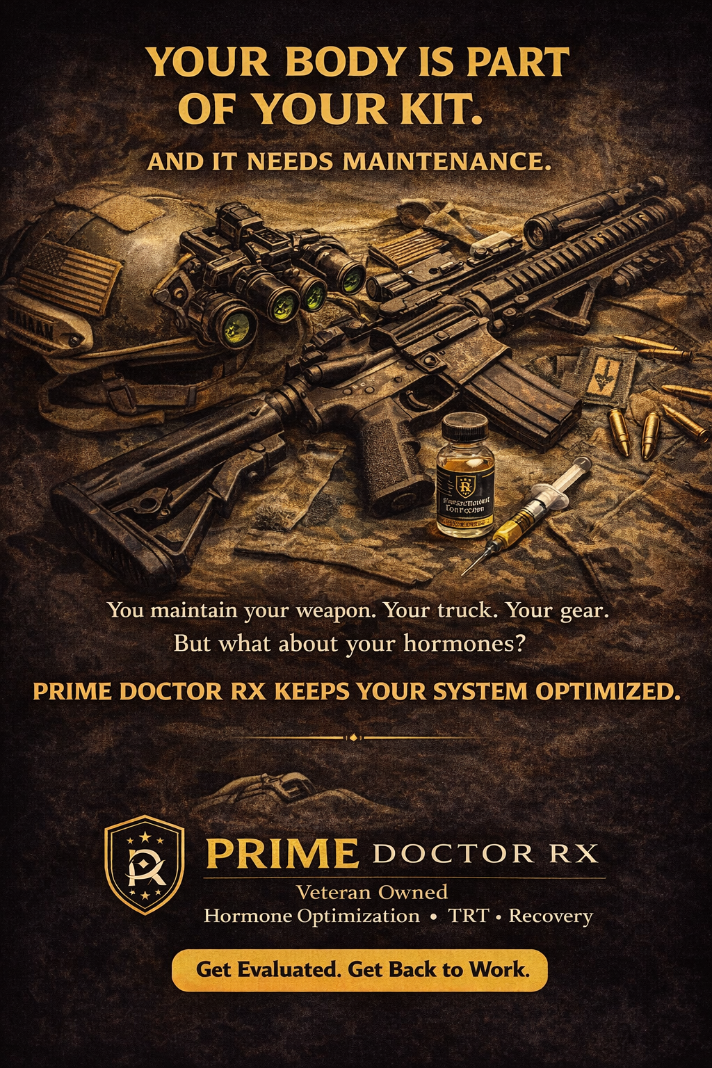 Operational stress, adrenaline cycles, and cumulative burnout can compound fatigue, low libido, mood changes, and poor recovery — symptoms that can overlap with low T and other medical issues.